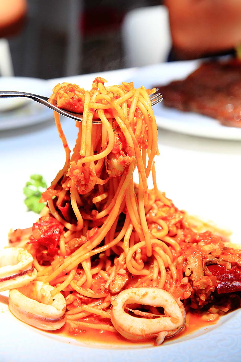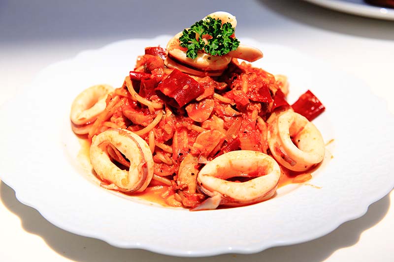 地中海蒜辣中卷義大利麵295元,滿滿的蒜香,帶點小辣,滿滿的中卷海鮮擺放成為焦點。