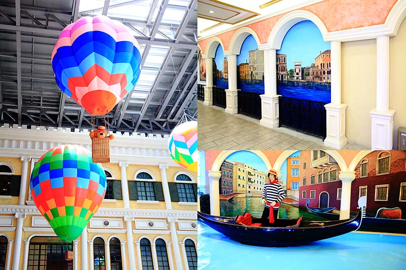 板橋大遠百店 非常異國風情,特別是9F這層,百貨公司現今都走浮誇與視覺性,還沒進入餐廳,就在周邊先打卡拍個不停,挑高空間,掛上敖翔天際的熱氣球,給予人夢想的藍圖想像,威尼斯船景無比夢幻。
