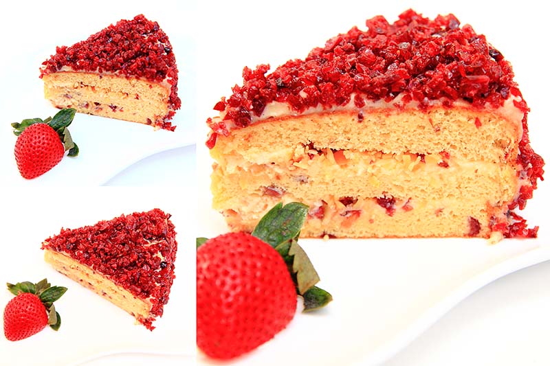覆盆子蛋糕,吃起來帶有酸酸的風味,野梅果粒感粒粒分明,餡料滿滿,屬於偏酸甜風味的蛋糕款。