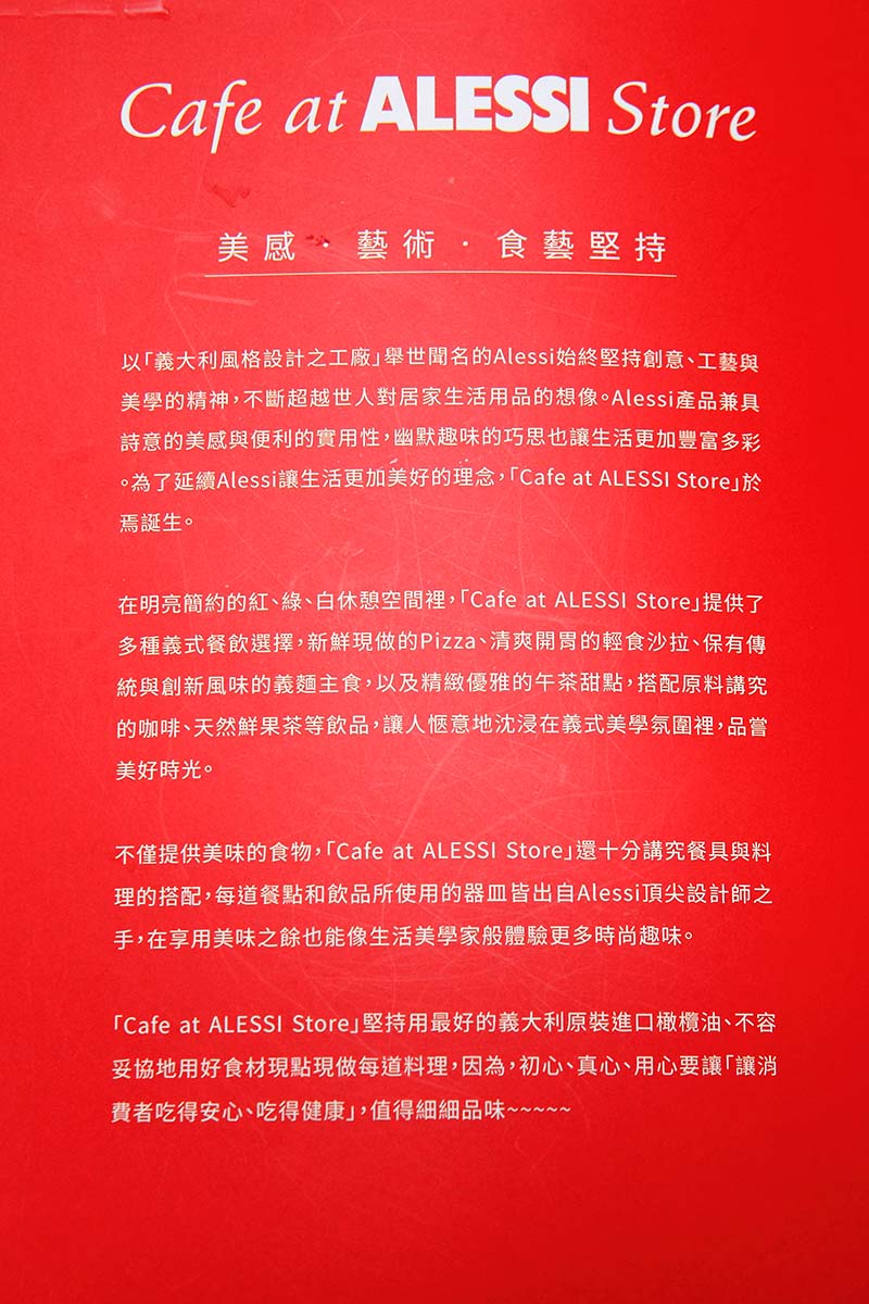 ALESSI Café板橋店 以義大利風格設計之工廠 舉世聞名的Alessi始終堅持創意、工藝與美學的精神,不斷地超越世人對居家生活用品的想像,Alessi產品兼具詩意的美感與便利的實用性,幽默趣味的巧思讓生活豐富多彩,延續Alessi讓生活更加美好的理念,Cafe at Alessi Store於焉誕生。