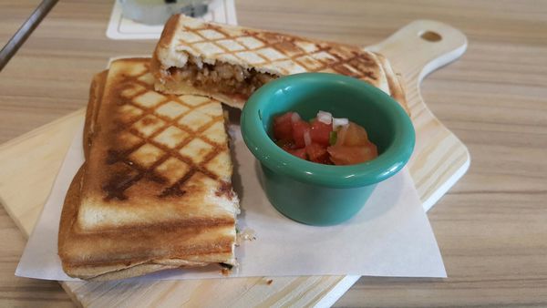 《吃飽飽吐司》點的是米米三杯雞,所謂米米三杯雞就是三杯雞炒米飯,還健康的夾了番茄,熱壓後配上莎莎醬開胃上桌。