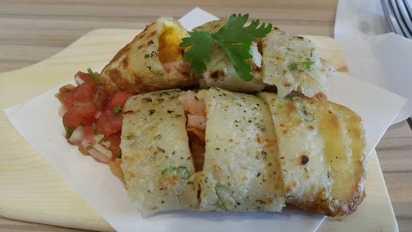 餡料滿滿的泡菜燻雞蛋餅wwwwwwwwwwww我真的超愛莎莎醬的!雞肉很嫩泡菜也酸甜爽口,意外的搭。