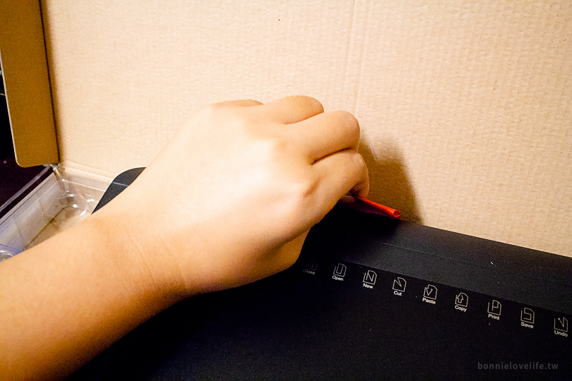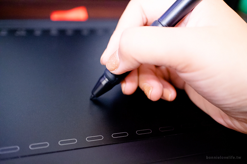 上方紅布是筆套的部分,若有習慣使用完後放回盒中收藏的人也可以由此輕鬆從盒中拉起。手繪板上的上下覆板總共有 26 個熱鍵,可以快速達成想要的指令,上排 Hot Key 的功能幾乎應有盡有真的還滿方便的。