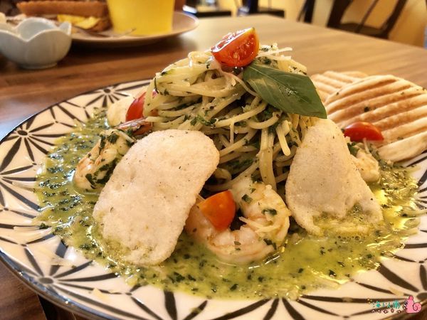 清炒義大利麵軟硬適中,適合台灣人的口感~搭上旁邊的蝦餅及香脆麵包可以沾著菠菜醬吃,讓這道義大利麵吃法更多樣