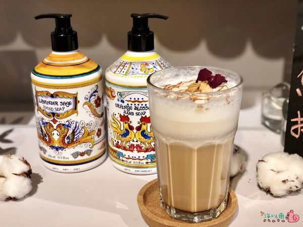 使用法國玫瑰露特調的鮮奶茶,上方灑著來自古坑的乾燥可食用玫瑰裝飾