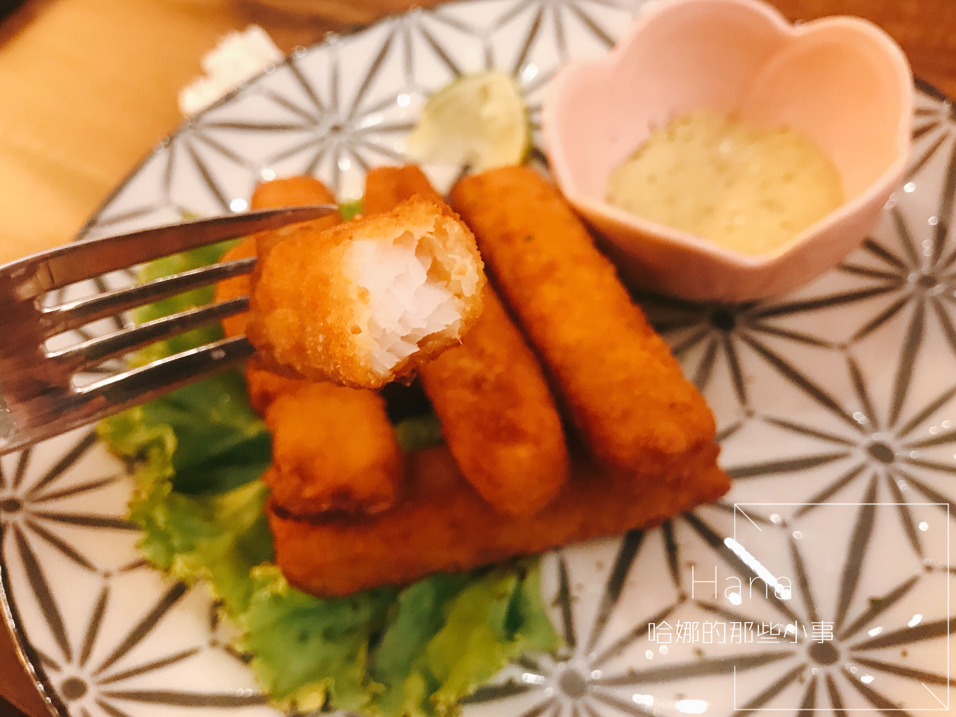 一旁的脆薯熱熱的沾上主廚特調的芥末蜂蜜醬,
