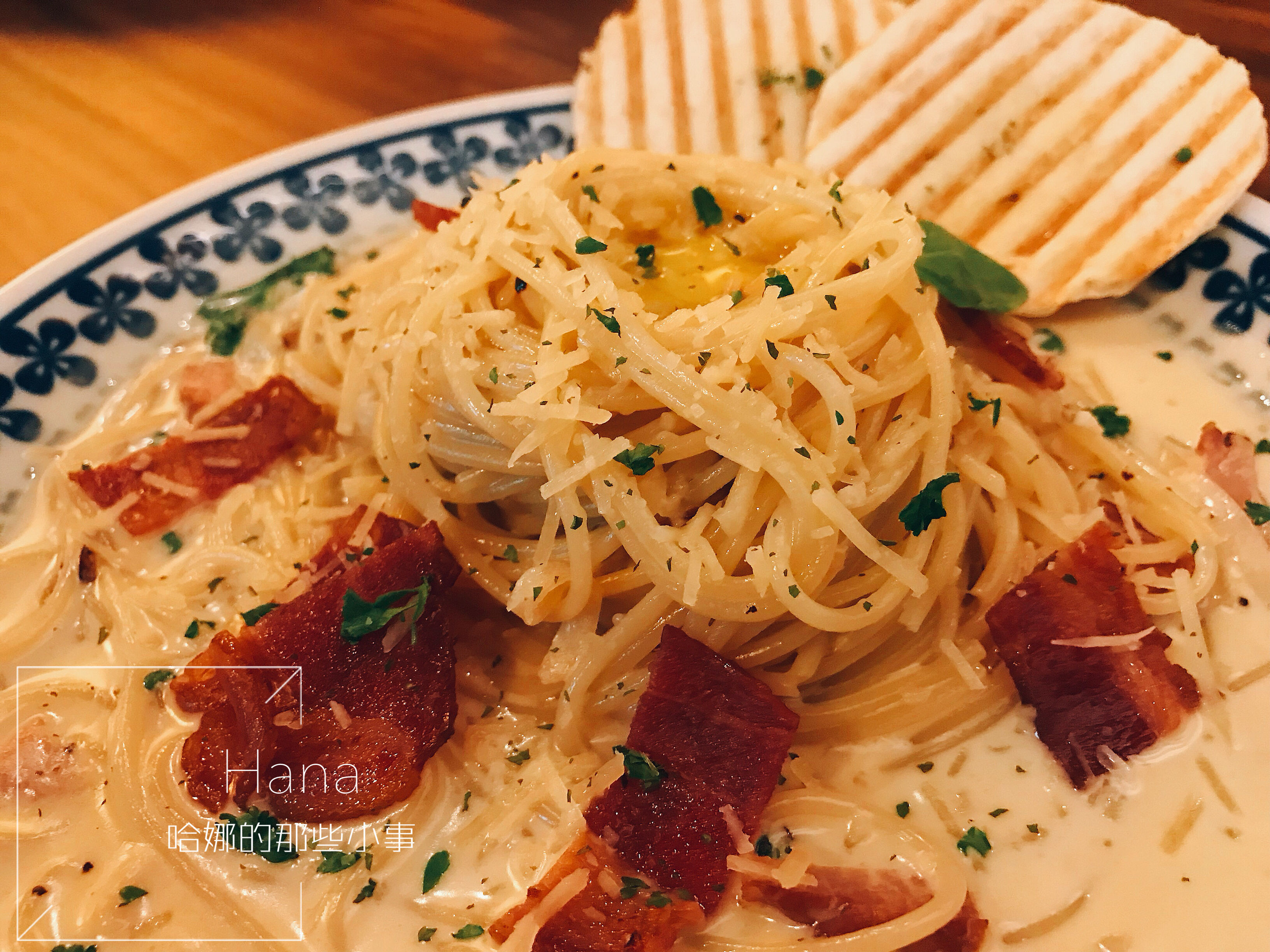 擺上煎的香氣十足的培根,灑上帕馬森乾酪,