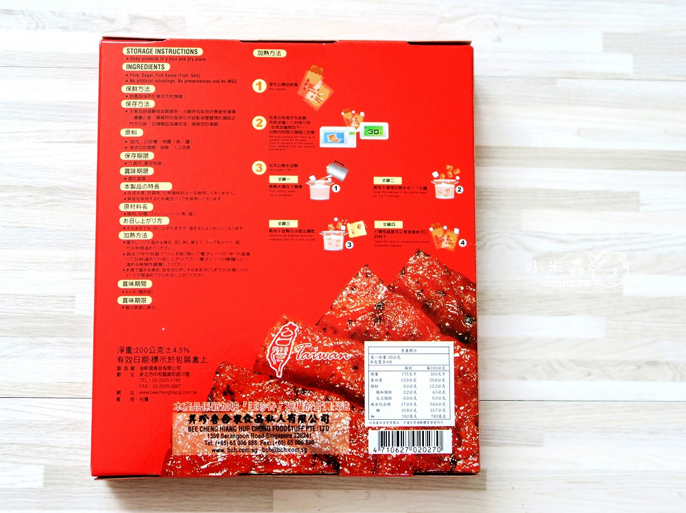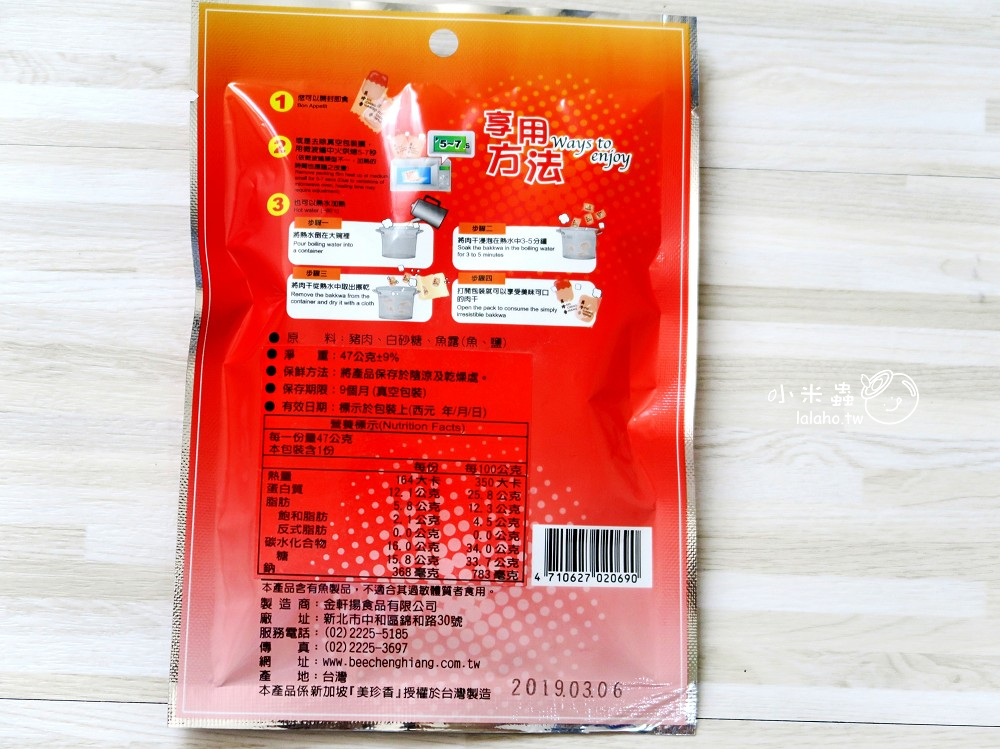 產品標示與營養標示都非常的清楚,最特別的是,肉乾不但可以拆開即食,也能加熱食用喔!