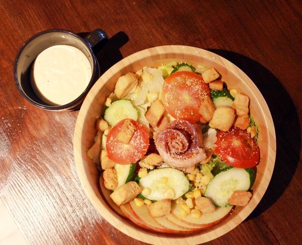 用木盆裝的沙拉分量十足,置於中央的燻鮭魚捲成一朵花,整盆顏色繽紛美麗。