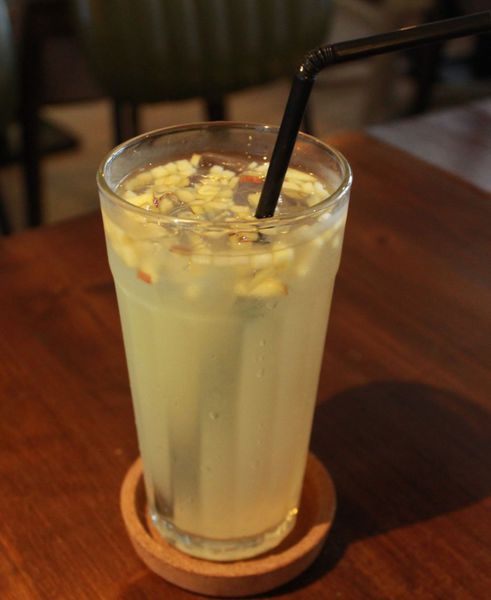 今日台北是用四季春烏龍茶、現榨檸檬汁、新鮮水果調和的,喝起來以檸檬為主,帶有茶香減少檸檬汁的酸澀感,切小丁的蘋果提供了果香。