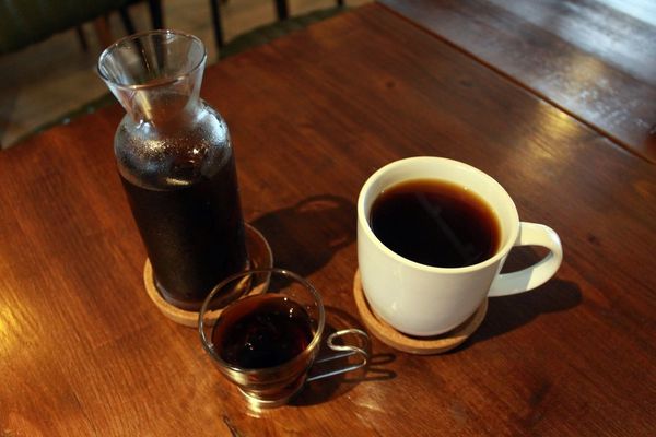 長玻璃瓶裝著黑中帶透的冰釀咖啡,看起來就沁涼冰心。用小玻璃杯一點點啜飲出長時間浸泡萃取的冰釀咖啡中清爽帶厚的口感。