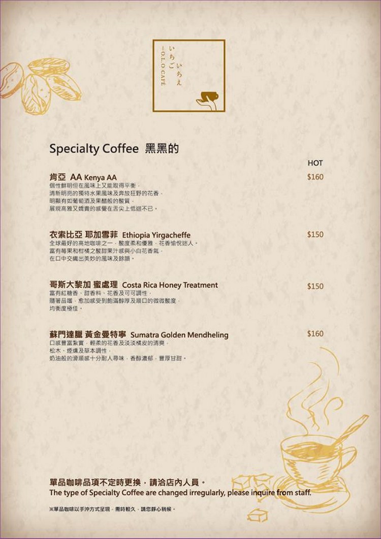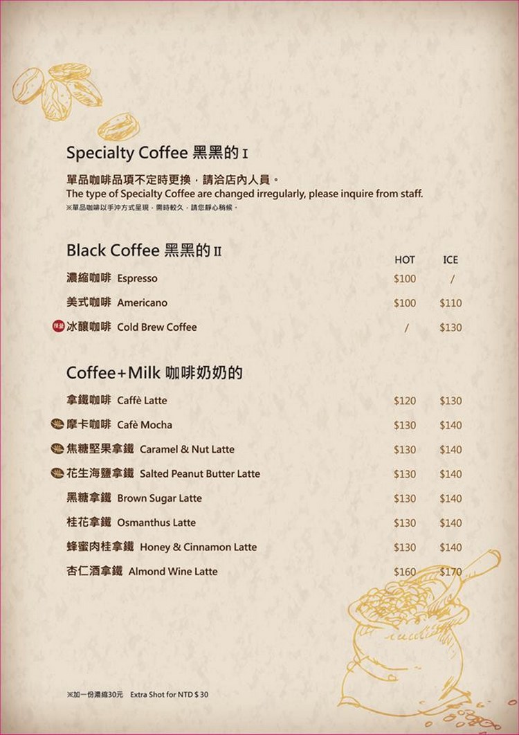 Hot 熱熱的/ 飽飽的、Light 輕輕的 (輕食/沙拉)、Cookie & Cake 甜甜的、Specialty Coffee 黑黑的.........
