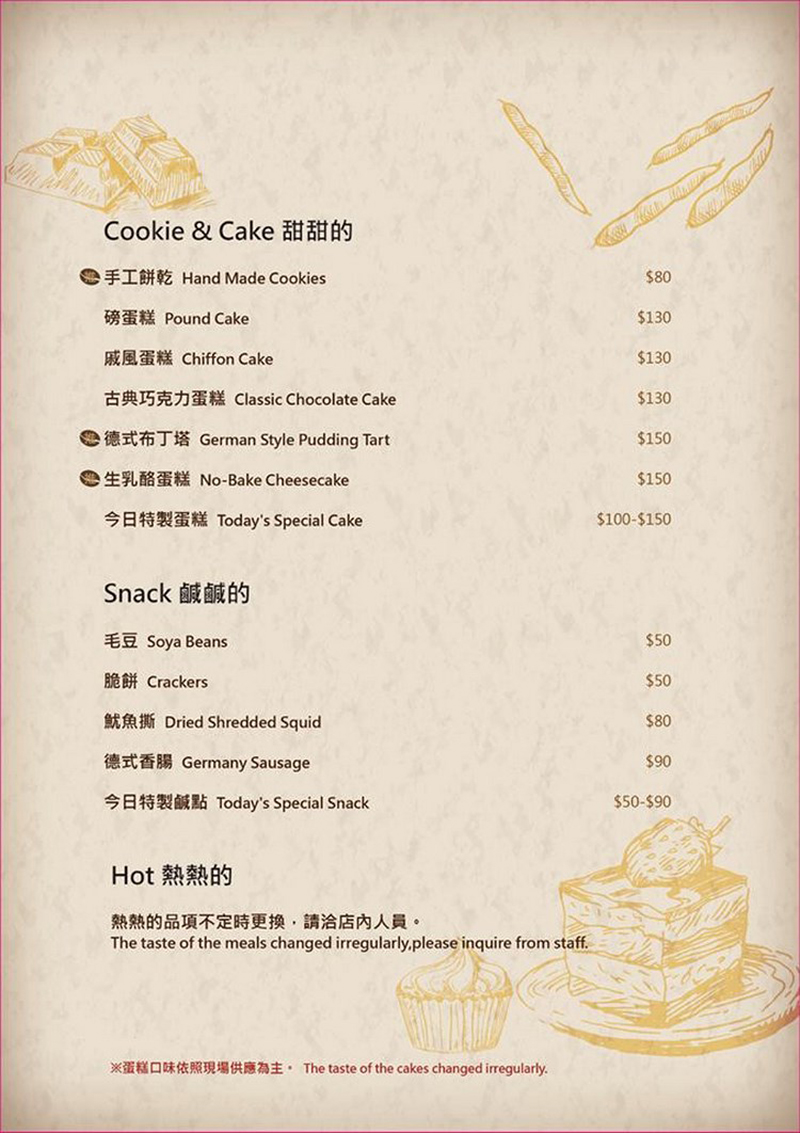 O.L.O CAFÉ菜單 從主餐:Hot 熱熱的/飽飽的 (餐食/麵食)(含附餐) Light 輕輕的 (輕食/沙拉)。甜點:Cookie & Cake 甜甜的、Snack 鹹鹹的。飲品:Specialty Coffee 黑黑的、Black Coffee 黑黑的II、Coffee+Milk 咖啡奶奶的、Tea 茶茶的、Tea+Milk 茶茶奶奶的、Milk 香香奶奶的、Mocktail 妙妙的(特調系列)、Juice 鮮鮮果果的、Ice 冰冰的,多種選擇,非常豐富,滿足附近上班族與住宿旅客需求。低消是每人一杯飲品或餐食。提供Wi-Fi服務插電。