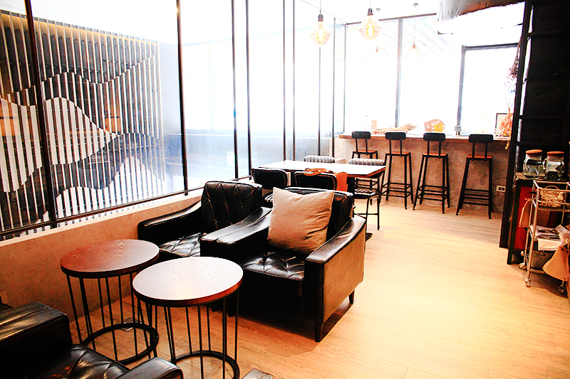 O.L.O CAFÉ 前半部分的用餐空間,採光明亮,比較現代加入工業風裝潢元素,黃色暖色系光源,高腳椅座位以及幾人座位的沙發區為主,深色系沙發陳列,擺放許多雜誌、書籍,提供翻閱,適合打發時間阿。