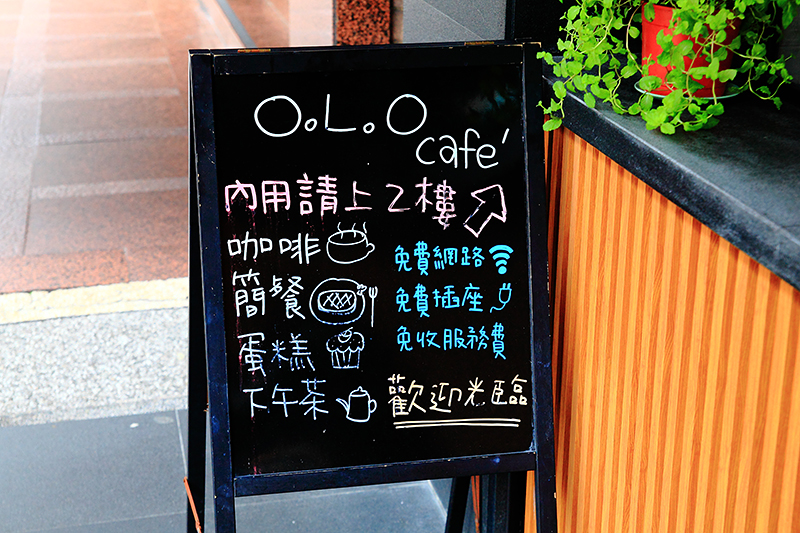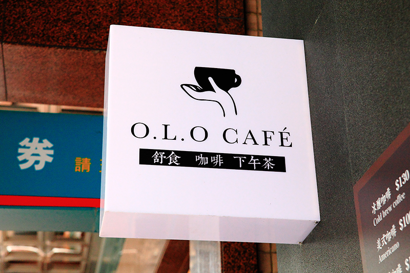 抬頭仰望,小小招牌,O.L.O CAFÉ 白底黑色字體Logo,呈現一種親和力的氣息。
