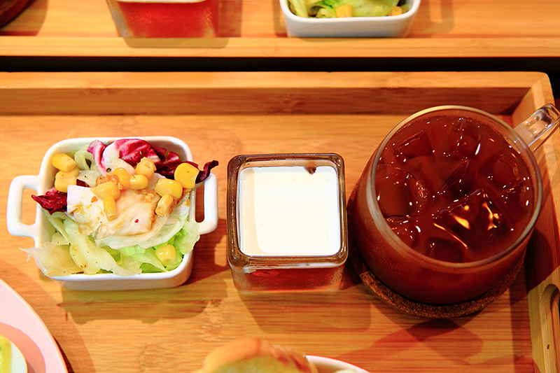 沙拉清爽不膩,是日系和風醬汁風味,搭配自然回甘,台灣在地小農栽種的好茶,紅茶不苦澀,好喝,讓人整個口感清新,茶香回味。
