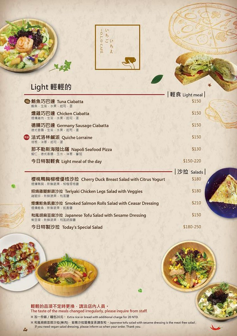 翻閱O.L.O CAFÉ menu介紹,可見名字大走創意,療癒性文筆形容修詞法,餐點種類,價錢不昂貴,精緻吃得飽的套餐路線。