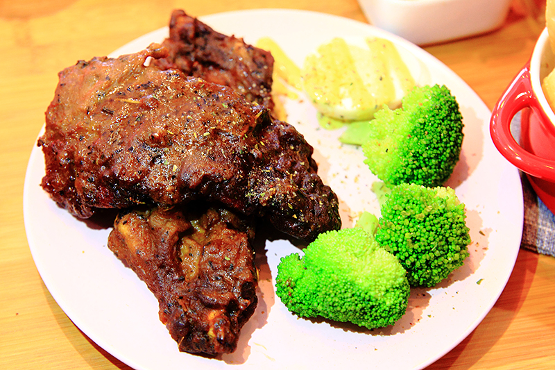 義式香草豬肋排,主要是用帶骨的豬肋排、洋蔥、丁香、茴香、芹菜子、肉桂、白酒,先把豬肋排醃製過,之後再香煎,豬肋排非常入味,不死鹹,搭配新鮮的花野菜,對比色系,視覺感很強,比較可惜是豬肋排骨太多,得要小心慢慢啃食。