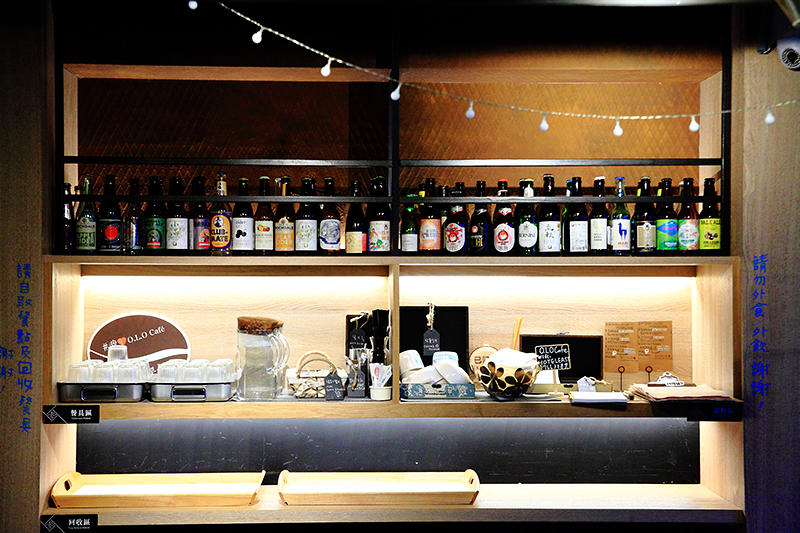 O.L.O CAFÉ 餐具和水也是自行拿取,用餐完畢也要自己放到回收區,所以餐點都沒有酌收10%服務費。櫃面上擺放許多酒瓶,可見這裡推出多款台灣小農啤酒,愛小酌的可以來試試看。(喝酒不開車,開車不喝酒)
