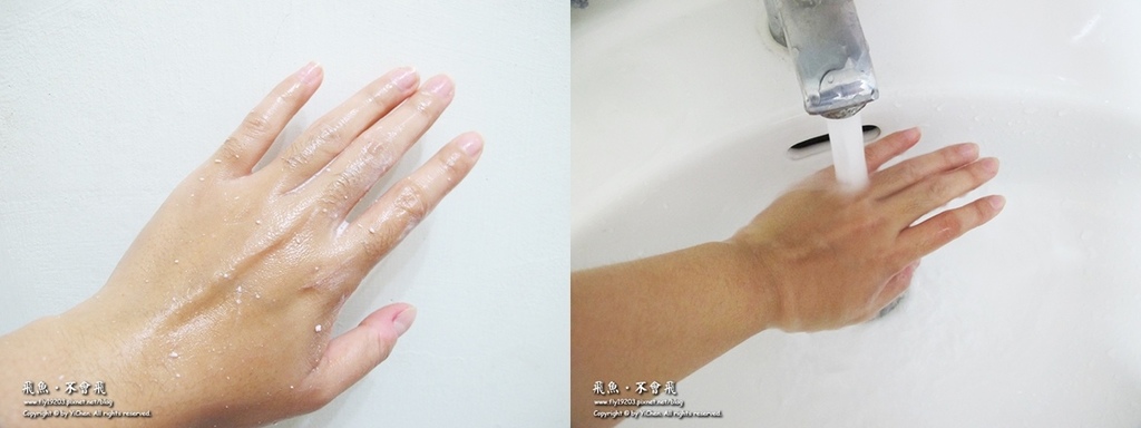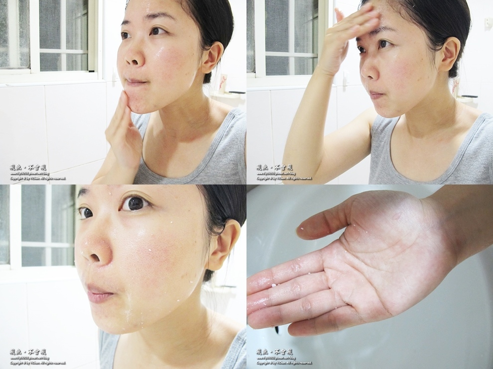 凝膠延展性很好,用指腹輕輕畫圓的方式直到白色雜質出現就可以沖掉了,冷水或溫手沖洗都可以