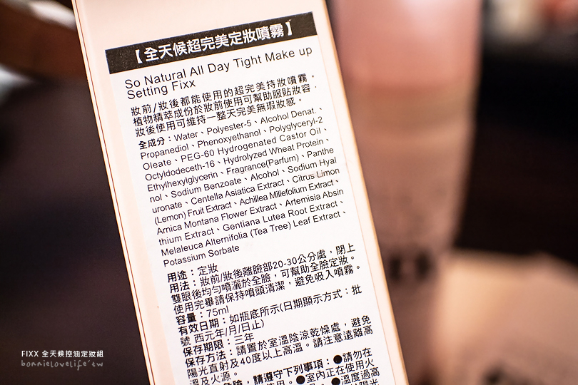 首先要說韓國來的彩妝系列產品都特愛用封條,SO NATURAL 也是不例外,這罐 FIXX 全天候超完美定妝噴霧添加了檸檬、茶樹精油與積雪草萃取,淡淡的香氣讓人定妝也能心曠神怡,噴霧粒子細緻溫和,在完妝最後階段噴上,不管是眼影、眼線、睫毛膏或腮紅都能一樣完美不暈染不脫妝,不僅控油它還添加了添加玻尿酸、維生素原B5,控油之於還兼顧保濕的一款定妝噴霧(超好用 😚)