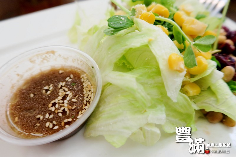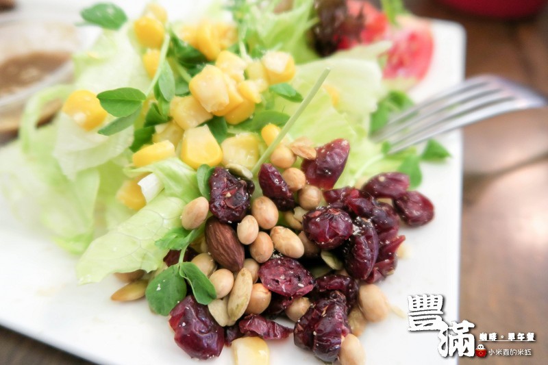 附餐沙拉有玉米、萵苣、堅果、蔓越莓、豆苗、番茄、紫生菜‥