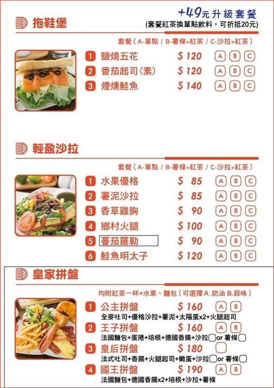 有以法國麵包為底的招牌三明治、鮮奶吐司、墨西哥薄餅、拖鞋堡、蔬食沙拉、皇家拼盤跟開胃小點心~