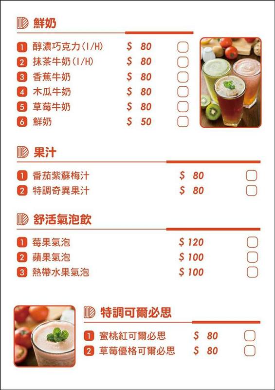 飲料則有茶、果汁、咖啡、調味拿鐵以及鮮奶系列