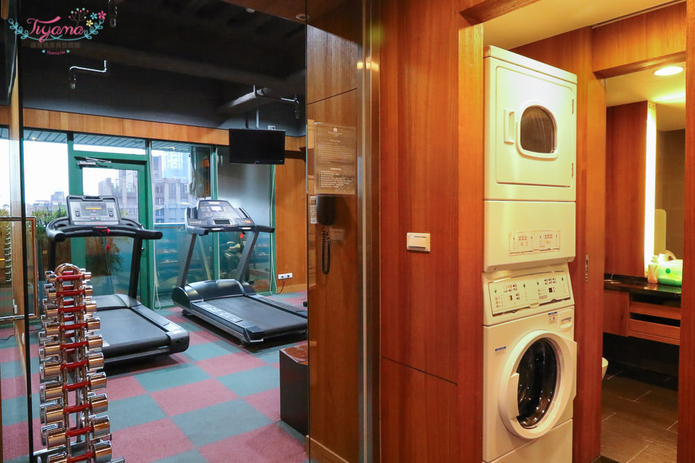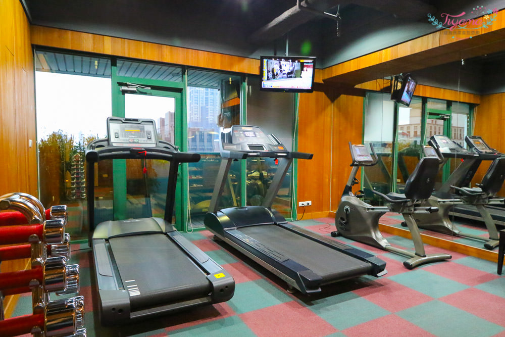 小而巧的健身房有跑步機、踩腳踏車機,後方有搖控器、毛巾、飲水機,可以邊看電視邊運動
