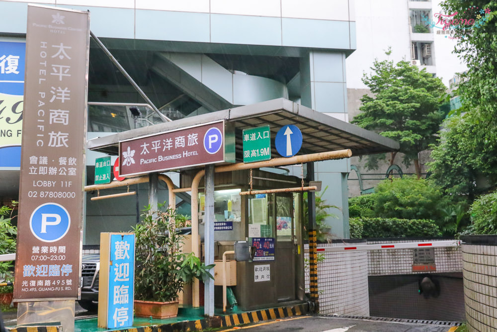 入住當日台北市下了場大雨,專用停車場從側邊車道直接進入,明顯的招牌…讓人遠遠就能看到,住客免費使用地下平面車位,只要開車離開前到櫃檯消磁,住宿期間可不限次數進出