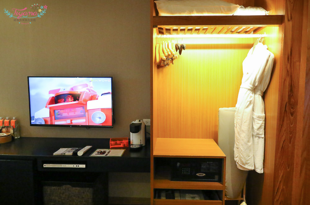 衣櫃打開,內有:浴袍、綾緞軟襯墊衣架衣架、保險箱、熨斗、燙衣板,為旅客準備的相當齊全