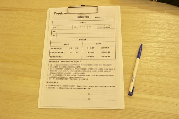 首先會先填寫一張諮詢意見表,與美容師詳談困擾部位,另外針對肌膚狀況做討論,是否會過敏,膚質是乾性抑或是乾性等,另外也針對熱蠟除毛的注意事項作解說。