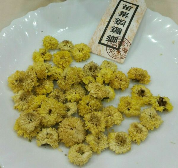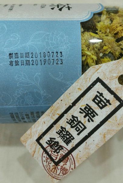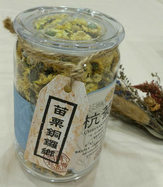 上方的吊牌記載著來自苗栗銅鑼鄉的杭菊花
