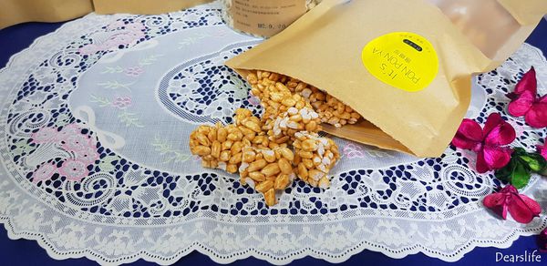 一大塊潔白的爆米香鑲著幾顆花生,大家分著吃。