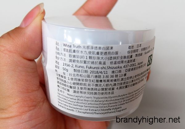 這罐光感淨透美白凝凍是從日本原裝進口,由White Truth研發的光感淨透美白凝凍,成分添加傳明酸,擁有七效合一的美白凝凍,(七效為乳液、精華液、化妝水、美容乳霜、眼霜、按摩霜、面膜),光感淨透美白凝凍非常適合懶人專用,天然的和漢成分中可以溫和的進行美白、淡斑的效果,還能達到24小時長效保濕,是一款非常保水、補水的產品。 光感淨透美白凝凍使用方式非常簡單,因為凝凍本身較水,所以建議大家可以一次挖10元硬幣的大小塗抹在臉上,由內往外推,將水分當作按摩霜,一邊按摩眼部周遭、拉提下巴,可以在時常缺水的部位加強厚度,強化亮白效果,若是有曬斑也可以敷在上面,光感淨透美白凝凍主打就是淡斑、美白,只要每日敷一些光感淨透美白凝凍,長久下來一定會有所改善膚質,如果被炎炎夏日曬傷,請考慮光感淨透美白凝凍做為你的補救救星!