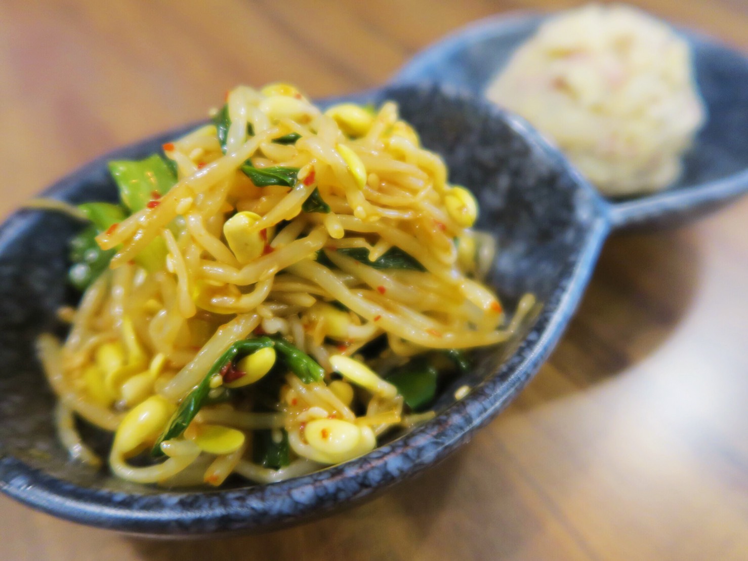 首先上場的就是開胃小菜嚕!首先是這道韓國美食「涼拌豆芽」,小編吃這前,看到吸睛豔麗的辣椒粉點綴其中,但入口後是香而不辣,反倒是嘴裡洋溢著麻油的迷人香氣,超級開胃的!