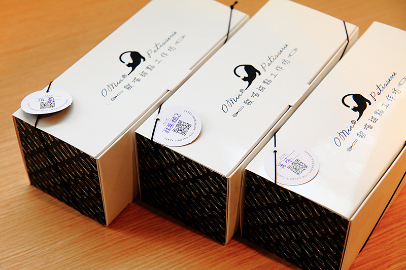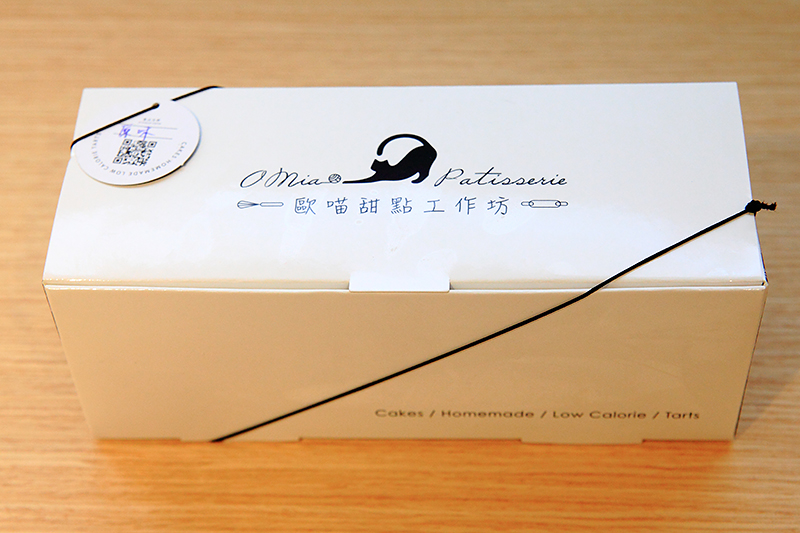 整個白色外盒設計,上頭印著O miao歐喵甜點,品牌識別Logo,非常精緻,加上黑色的繩袋,一整個很有質感,光看貓咪圖示,想必此甜點品牌主人很愛貓。
