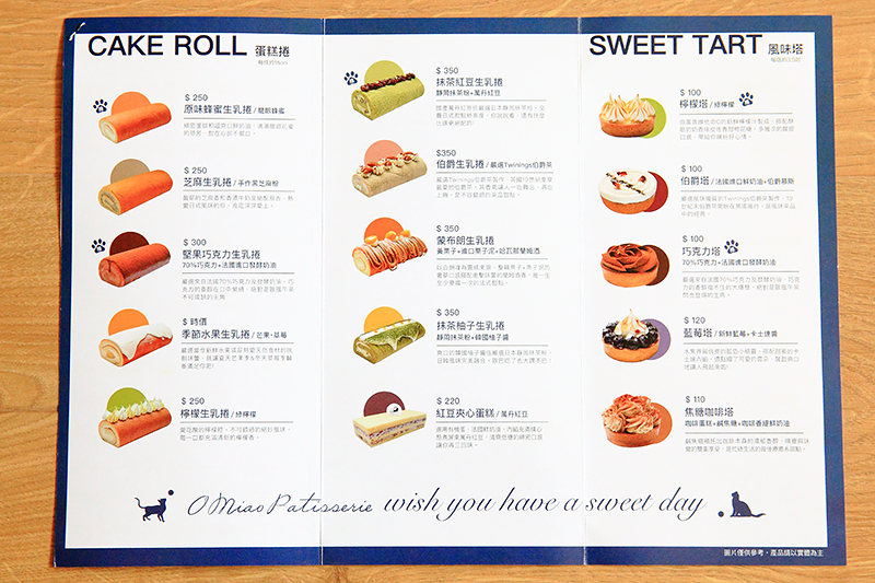 O miao歐喵甜點 店內蛋糕分成多款口味,附上價位說明:
