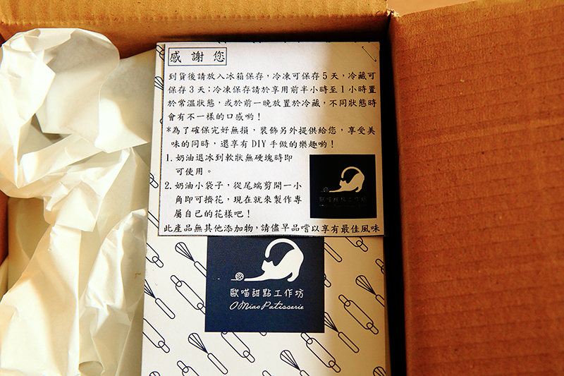 打開包裝,可見裡頭O MIAO歐喵甜點 蛋糕盒包覆好好的,非常完整,上頭有張DM說明,以及拿到蛋糕的使用須知。