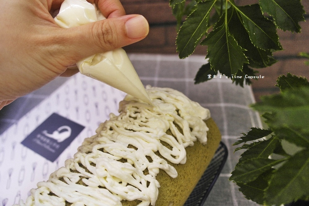綠色抹茶蛋糕捲上是店家附的DIY白色鮮奶油,