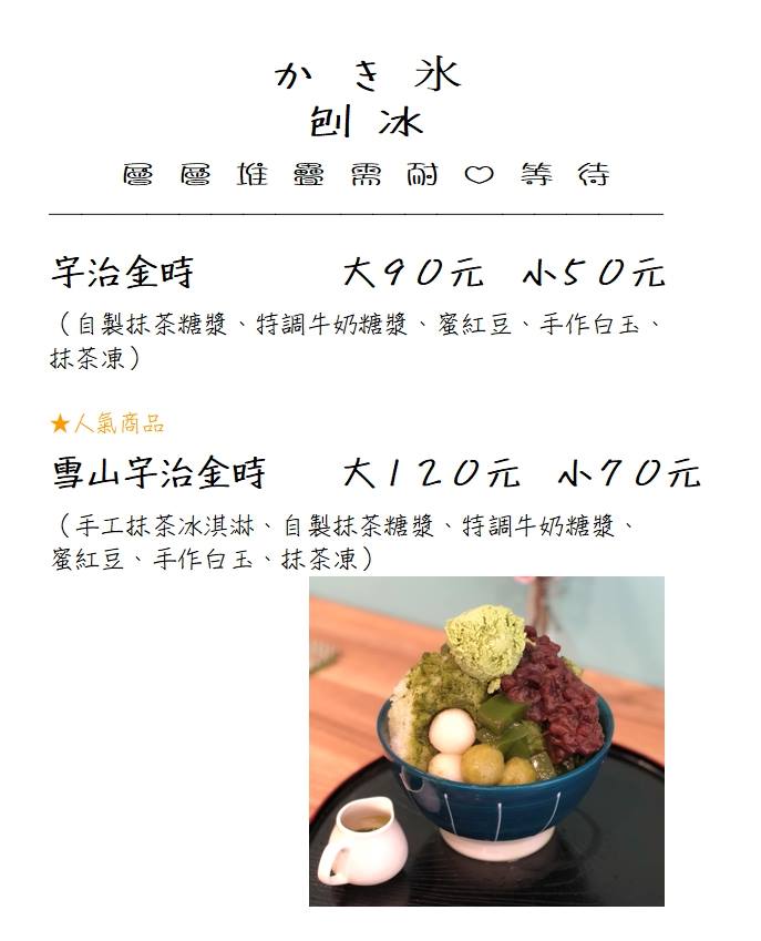 層層堆疊的日系刨冰,口味以宇治金時、焙茶金時、黃豆粉金時等三款共六種為主