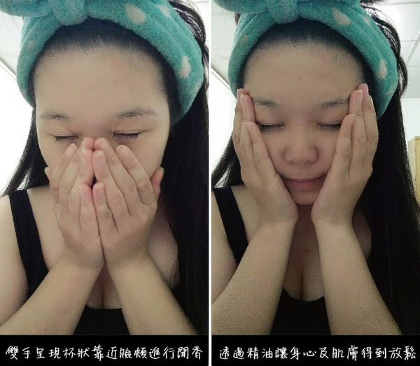 雙手在呈現杯狀靠近臉頰進行聞香動作,接下來深呼吸個1-2次,用天然的香氛療法讓珍貴的法國精油透過聞香動作使肌膚放鬆,在保養過程中小准是比較建議可以洗完熱水澡之後再做保養,透過熱水的蒸氣全身毛孔都還是打開的狀態下精華液吸收會更好喔!