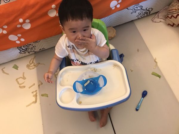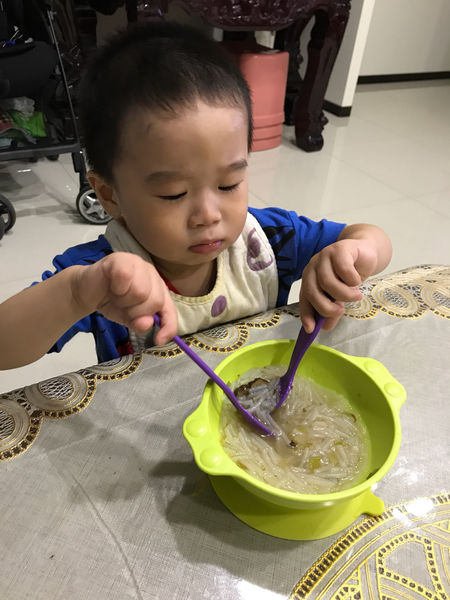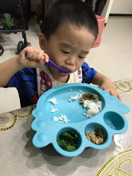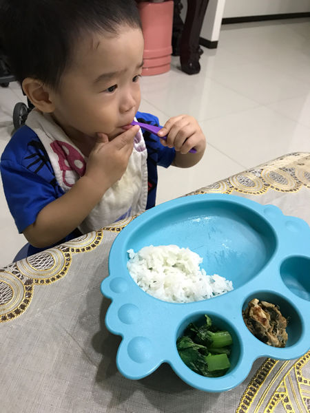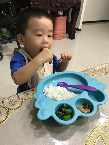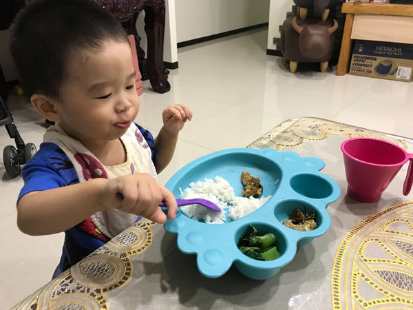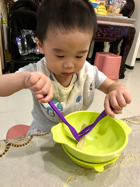 現在小肉肉副食品吃的越來越多元化,也漸漸開始讓他學用餐具,自己拿湯匙、叉子練習吃飯了