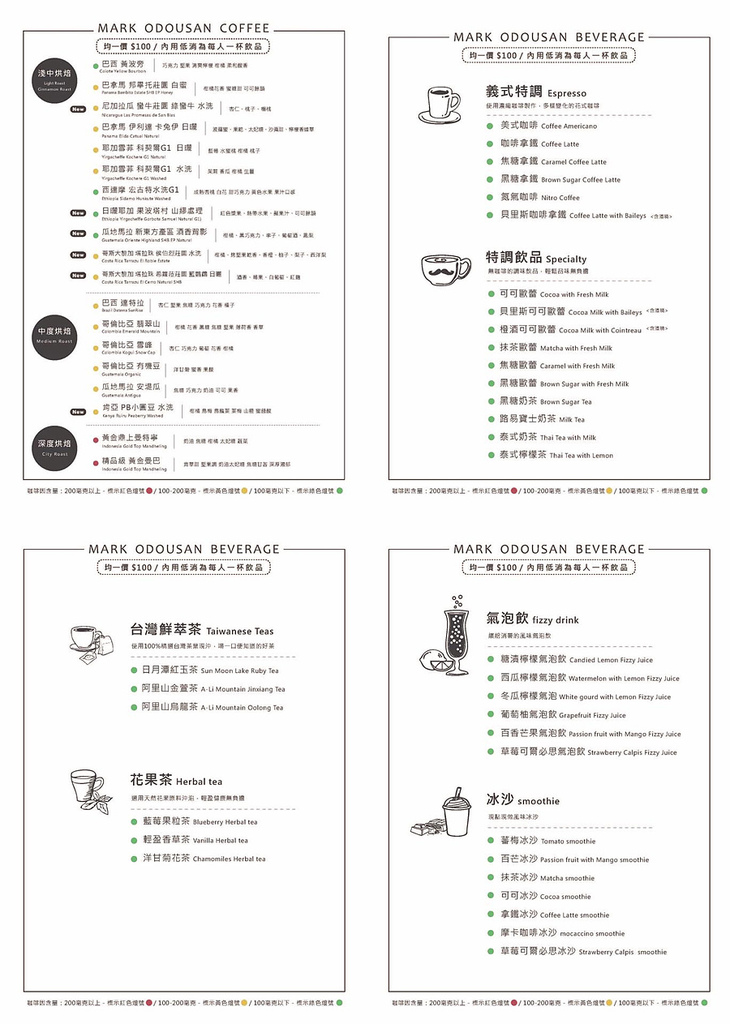 MENU上貼心的標示出每款飲品的咖啡因,除了咖啡還有茶、花果茶、氣泡飲、冰沙。