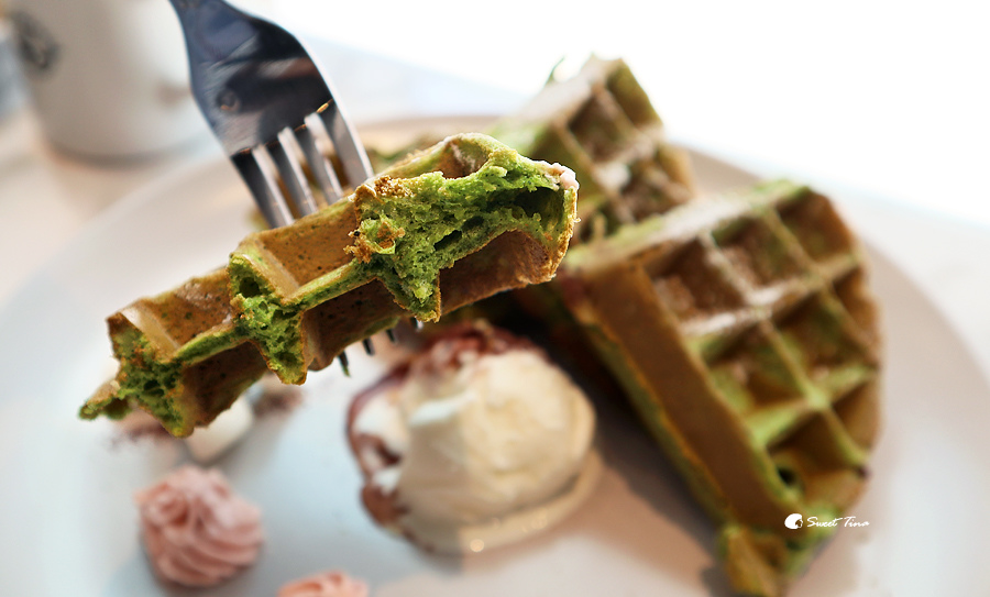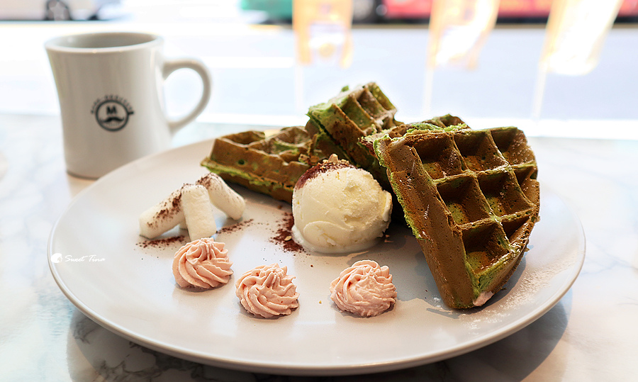 冰淇淋鬆餅(丸久小山圓抹茶) - 抹茶鬆餅搭配香草冰淇淋、棉花糖、草莓奶油,屬於清爽型的鬆餅,鬆餅本身沒有什麼甜味,搭配奶油、冰淇淋、棉花糖後挺剛好的。