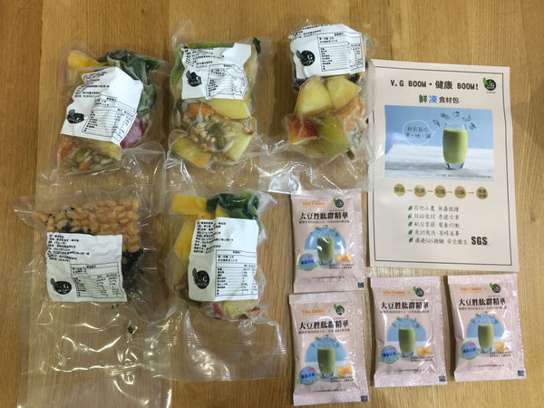 6種季節有機葉菜+5-6種綜合堅果+鳯梨+蘋果+主題水果+大豆胜肽