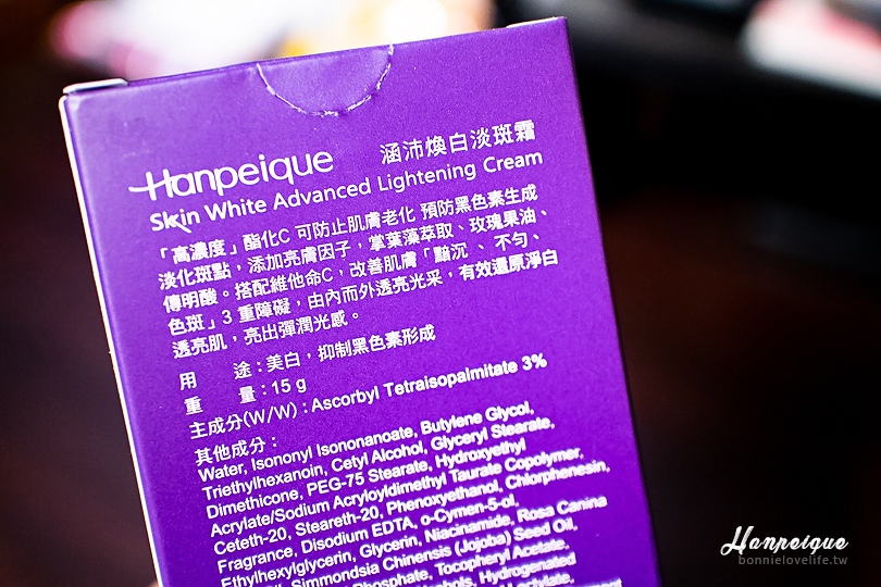 涵沛Hanpeique這次結合衛生暑核准多重美白成份酯化C、傳明酸、鈉鹽左旋C,推出頂級極致淨斑美白的涵沛煥白淡斑霜,剛好讓我今年夏天曬出的小小曬斑得救了!女生真的很多煩惱,想要皮膚變白結果又讓斑顯得明顯,保養真的是一步都不能少~除了每日出門前的防曬外,平日保養可以考慮這條涵沛煥白淡斑霜,淨斑美白一次達成!