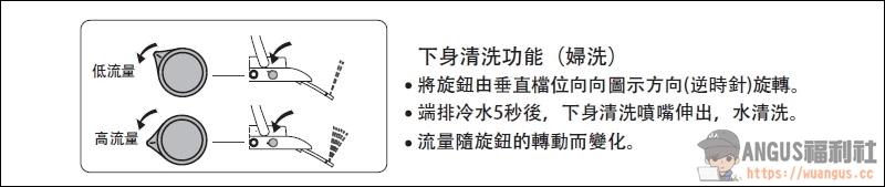 ▼ 在使用『婦洗』時,只要將旋鈕向後旋轉即可,水量隨旋鈕的轉動而變化,角度越大則出水量就越強,相對的清潔噴嘴也會自動伸出,可以看到清洗噴嘴伸出為右邊水量較散。