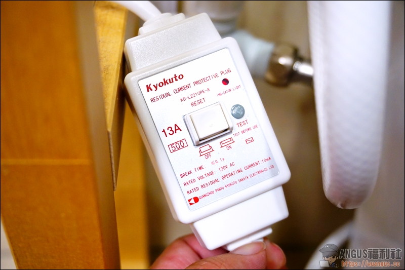 ▼ 在安裝 KW-206 電腦馬桶座時,就有考慮到浴室使用電子產品是否安全的疑慮,直到後來看到師傅介紹到這個漏電保護器後,才明白其實在使用上是非常安全的,這款漏電斷路器採用日本 Kyokuto 品牌,遇到漏電時會自動斷電,相當安全,師傅也建議消費者至少每月檢查一次保護器。