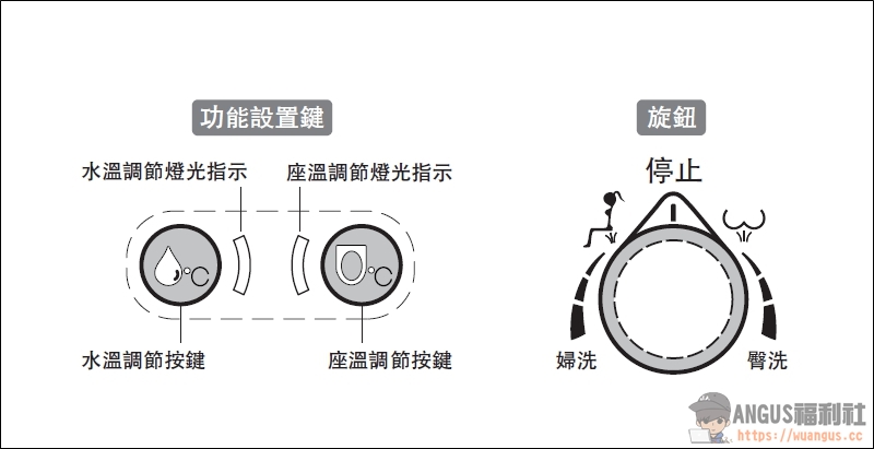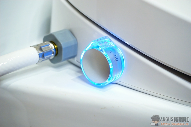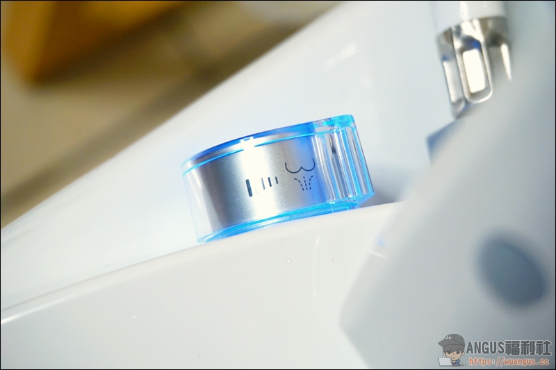 ▼ 在KW-206電腦馬桶座的左側為調節旋鈕,旋鈕經通電後也會亮燈,讓消費者很容易就辨識旋鈕的位置在哪,簡單來說旋鈕向前是『臀洗』而向後則是『婦洗』,右側則是『水溫調節』與『座溫調節』按鈕。